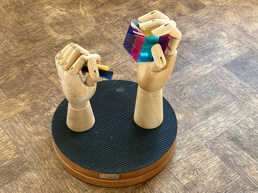 Wooden artist hand models, red/blue/yellow/black pastels, acrylic Cyan/Magenta/Yellow cube. 2021