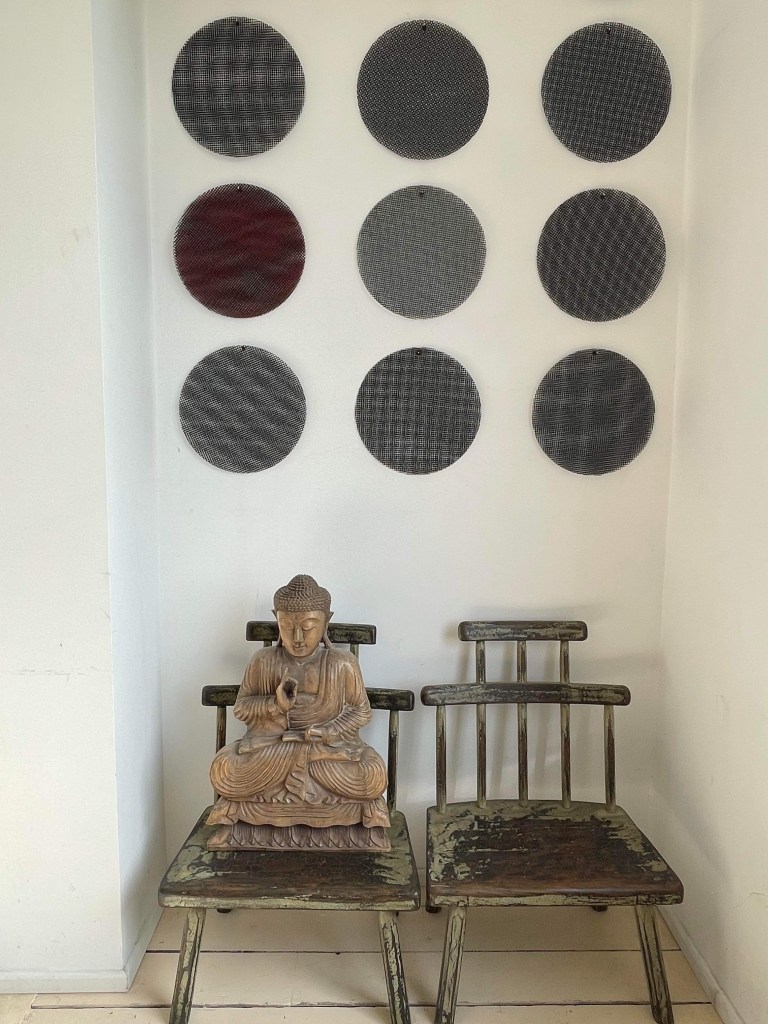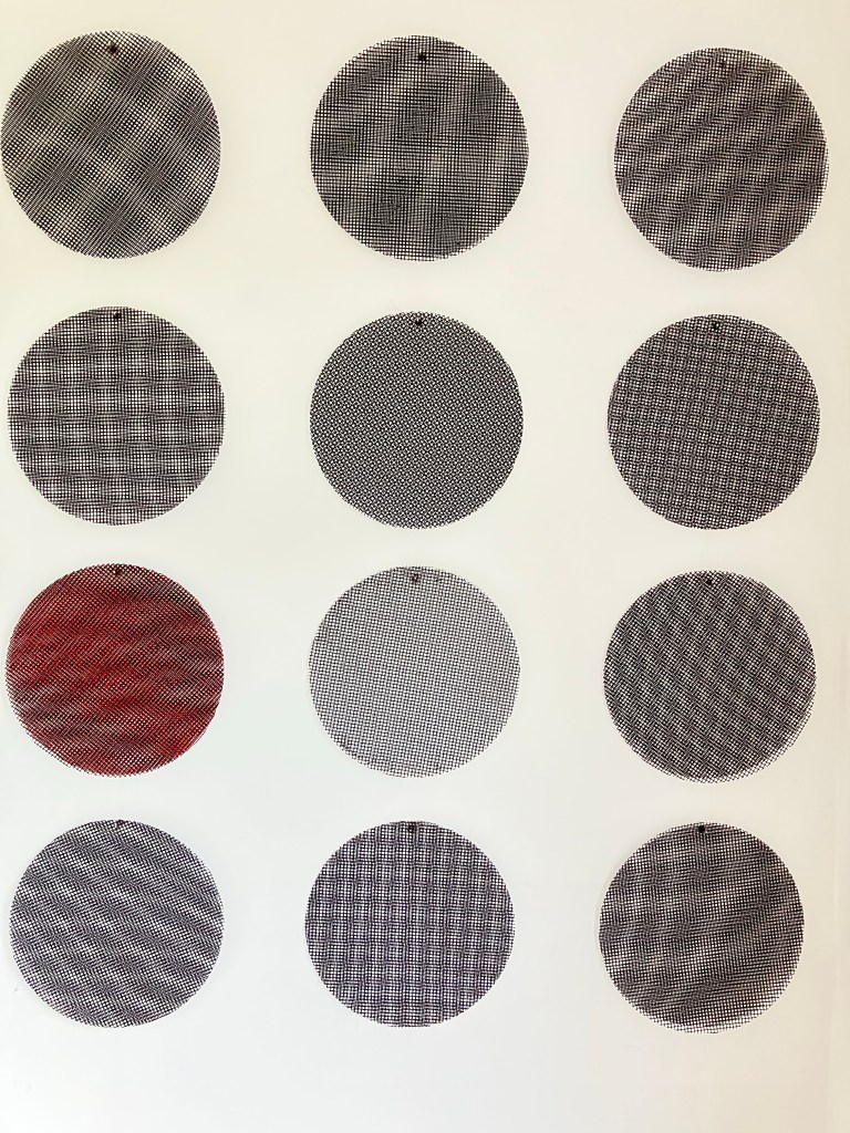 A dozen pairs of Teflon mesh discs, two coloured with industrial paint.